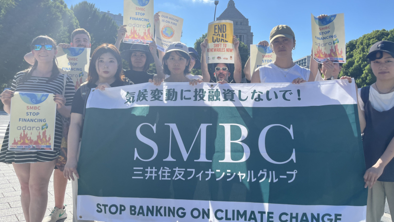 Activists in Tokyo demonstrated outside the National Diet Building in Tokyo to demand that MUFG, SMBC and Mizuho banks stop funding coal expansion projects.