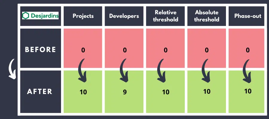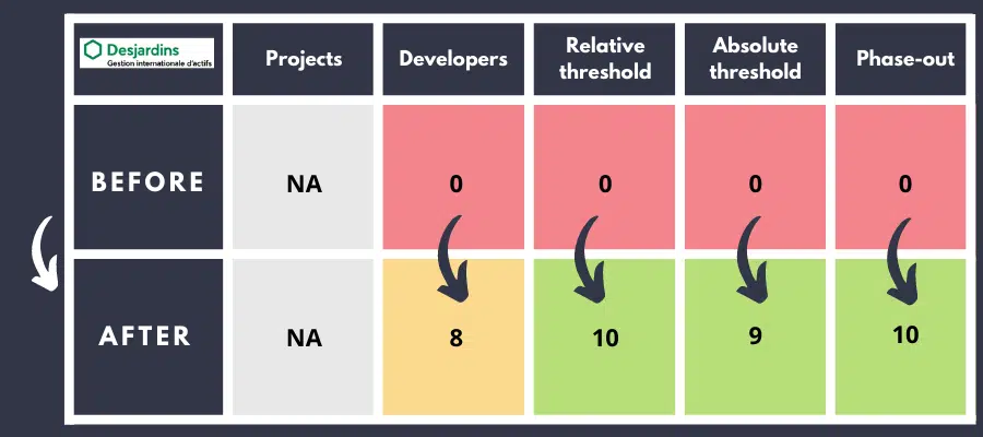 On the other hand, on the investment side, the policy will apply only to assets owned by Desjardins, i.e., only 55% of the total assets managed by Desjardins Global Asset Management. The Québec group has yet to extend this coverage to all of its 56 billion dollars of assets under management.