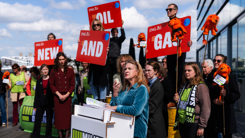 The meeting was preceded by a demonstration by campaigners, including dozens of the bank’s business and retail customers. Standing on huge oil drums bearing the slogans ‘Not with my money’ and ‘No new oil and gas’, they called on the Netherlands’ largest bank to stop financing the climate crisis. The demonstration was supported by Milieudefensie, Milieudefensie Jong, Fossielvrij NL, BankTrack, Better Brazoria, Break Free From Plastic and Fair Resource Foundation.