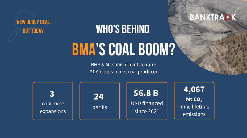 A new Dodgy Deal profile from BankTrack reveals that 24 banks have provided USD 6.8 million in finance to coal developer BMA Alliance's parent companies, BHP and Mitsubishi, since 2021. By doing so, they are financing the third-largest driver of metallurgical coal expansion globally.