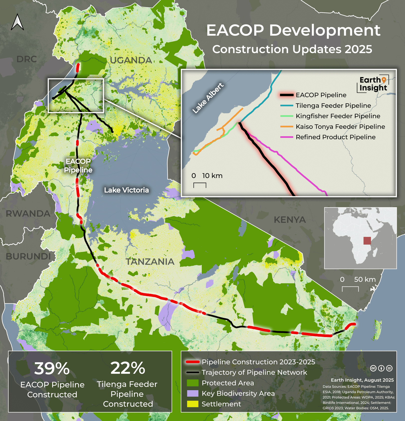 The pipeline has been described by the project companies as over 60% complete. However, analysis of satellite imagery by EarthInsight shows less than 40% of the pipeline has been laid. The same analysis also shows roads cleared for the pipeline reaching the Victoria Nile riverbank, signalling an imminent, high-risk crossing of this river in an area that overlaps with protected wetlands and the Murchison Falls National Park. Well pads which will feed the pipeline are being constructed in the National Park, with tragic consequences for local people as vibrations from drilling rigs cause elephants to move to surrounding communities. The elephants are destroying cropland, and have killed at least five people in the area in 2023 and 2024.