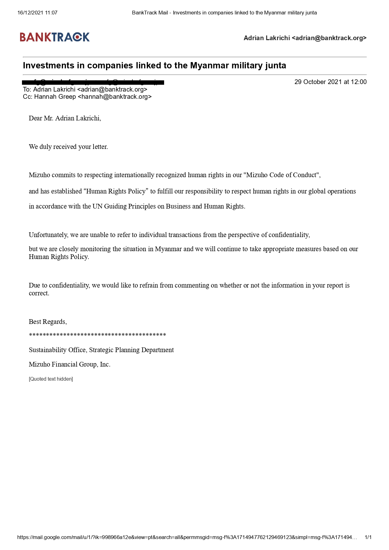 Mizuho is a member of the Japan Center for Engagement and Remedy on Business and Human Rights (JaCER), which operates a grievance mechanism based on the UN Guiding Principles on Business and Human Rights, the “Engagement and Remedy Platform”. Individuals and communities affected by the bank’s finance can report human rights grievances here. Stakeholders may also raise complaints via the OECD National Contact Points (see OECD Watch guidance).