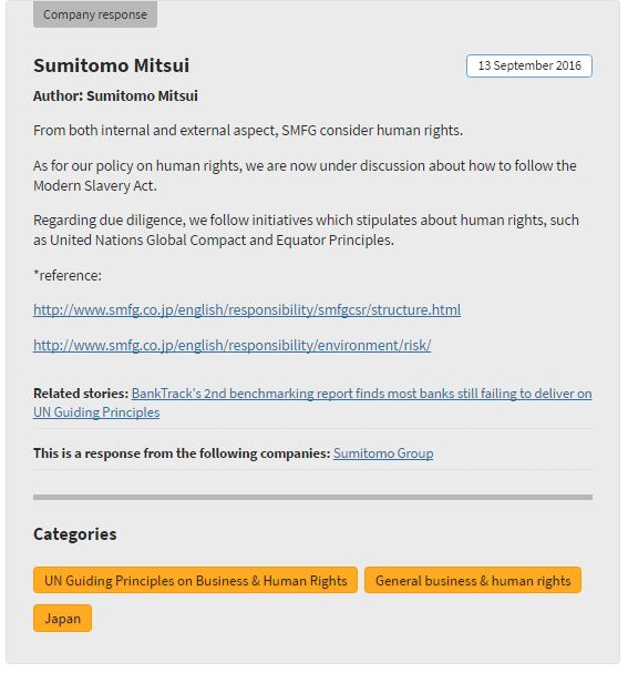 SMFG is an Equator Principles signatory. While the Equator Principles have no official grievance mechanism, complaints relating to this bank's financing of Equator Principles projects can be filed through our own website www.equator-complaints.org.