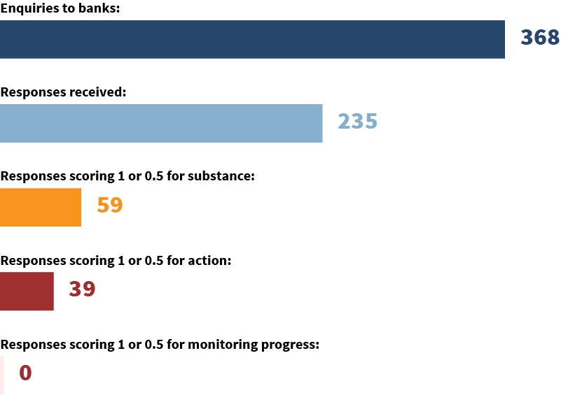 Only six responses out of these 126 gained any score at all. In the remaining cases, banks either did not respond, or where they did, their response neither comment on the substance of the issue raised, acknowledge the bank’s link to the impact, or set out any action taken.