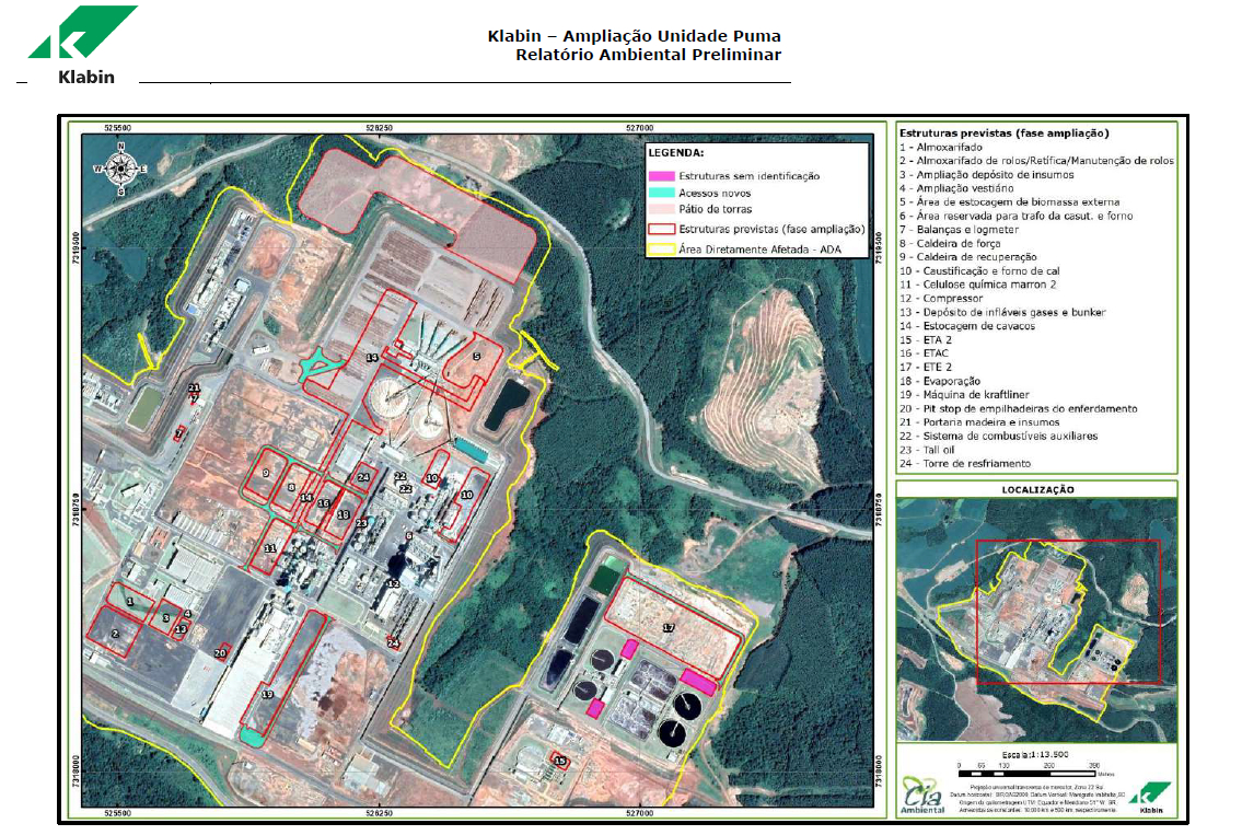 No Environmental Impact Assessment for Puma II pulp mill In April 2019 Klabin obtained an installation license for Puma II, without having done an Environmental Impact Assessment. Puma II pulp mill will require approximately 100,000 hectares of eucalyptus and pine plantations. Since the company argues this is an expansion of its existing mill, Klabin did not make an Environmental Impact Assessment for the project, although it will almost double the capacity of the mill. In the Preliminary Environmental Report it does not provide any detailed information on where it will source the required fibre from.