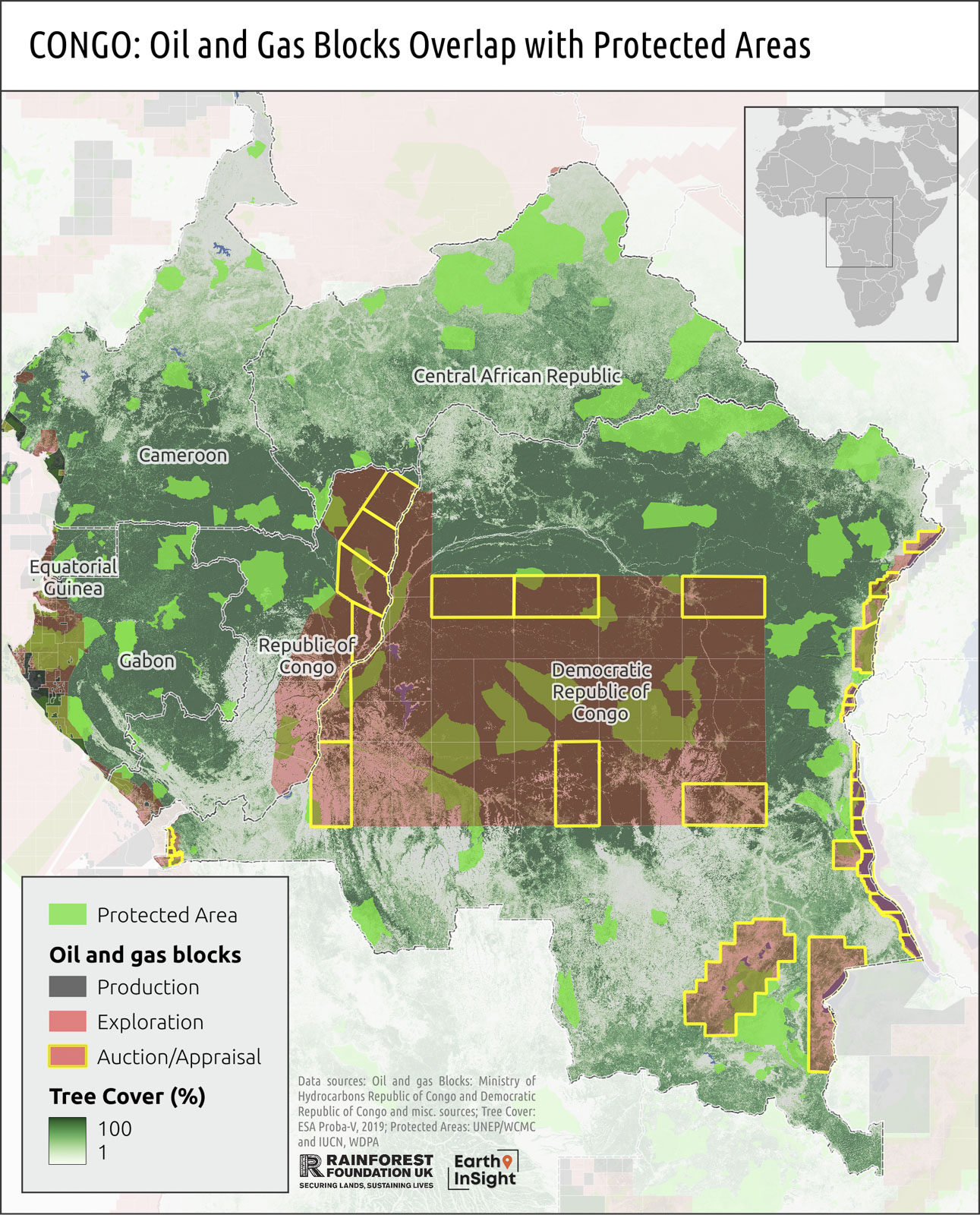 Congo: oil and gas exploration and auction blocks and conservation areas (EarthInsight)