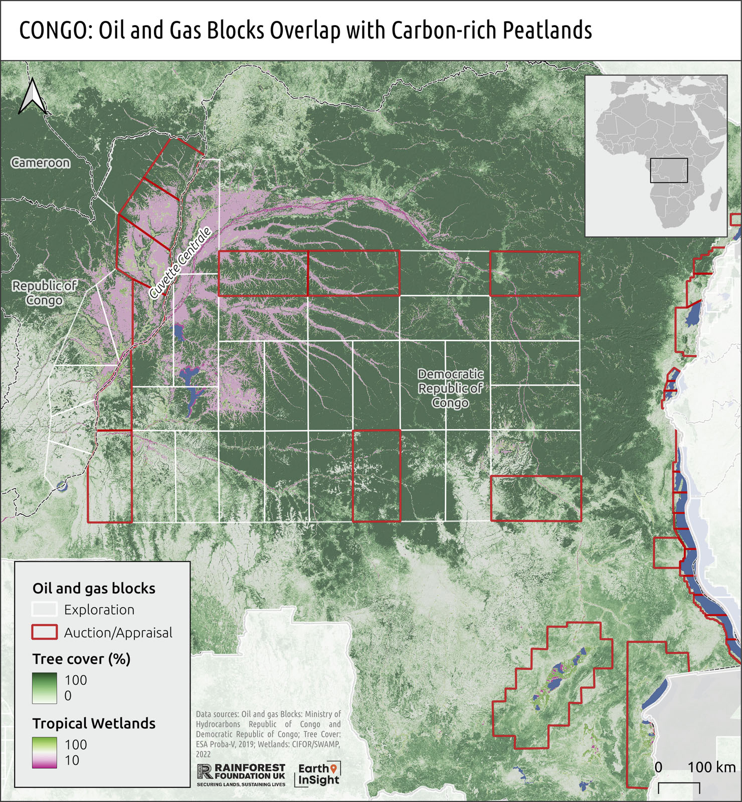 Oil extraction will take place in the Congo Basin, the world’s second-largest forest basin, second only to the Amazon rainforest, and in the world’s largest tropical peatlands. The oil blocks in DRC overlap with 8.3 million hectares (23%) of protected areas, 8.6 million hectares (23%) of Key Biodiversity Areas, and 66.8 million hectares (64%) of intact tropical forests, according to EarthInsight's analysis. At least 13 of the oil blocks up for auction overlap with protected areas. Fossil fuel exploration disturbs peatlands, as contaminants spread quickly and easily – dragged along by flowing water – and persist for years.