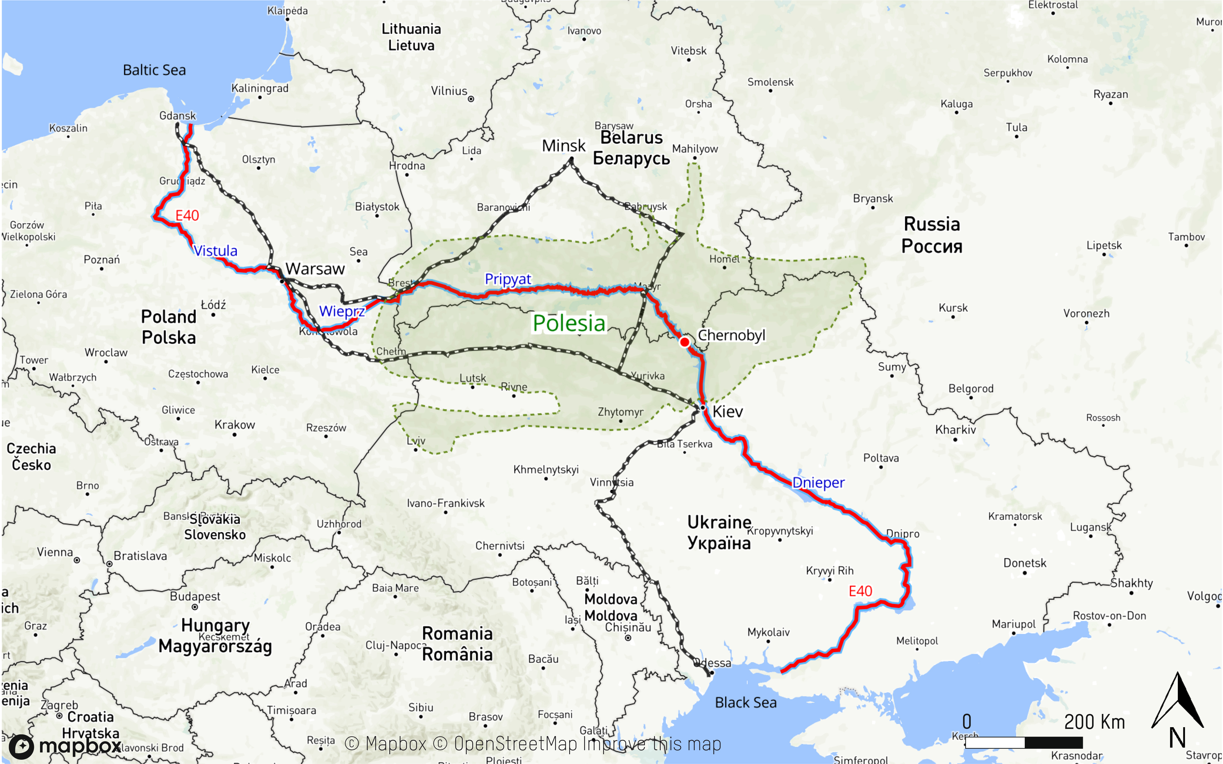 Existing railroads (black) connecting Gdansk in Poland with Odessa in Ukraine as an alternative to the proposed E40 waterway (red), which would cut through the heart of the wetland wilderness of Polesia (dashed green line)