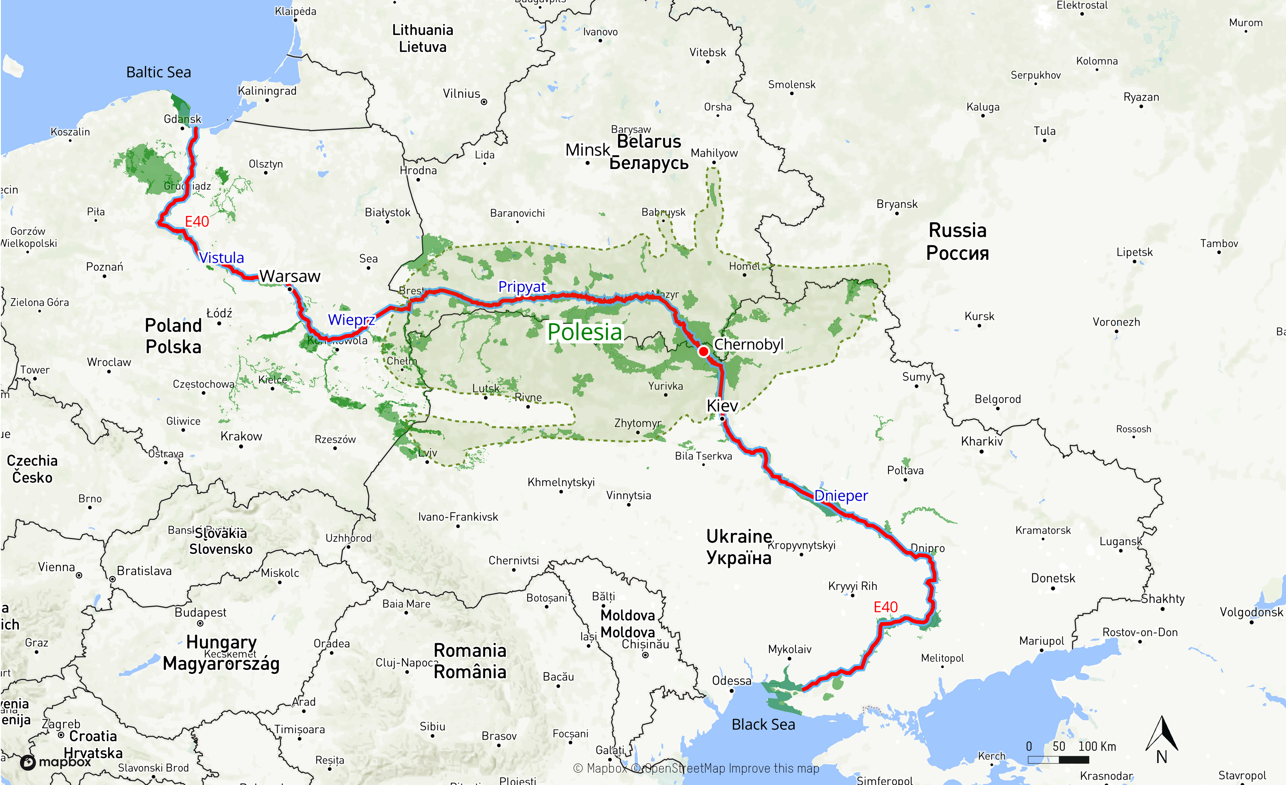 Route of the proposed E40 waterway (red) connecting the Black Sea and the Baltic, which would cut through the heart of the wetland wilderness of Polesia (dashed line) and impact internationally protected areas (dark green)