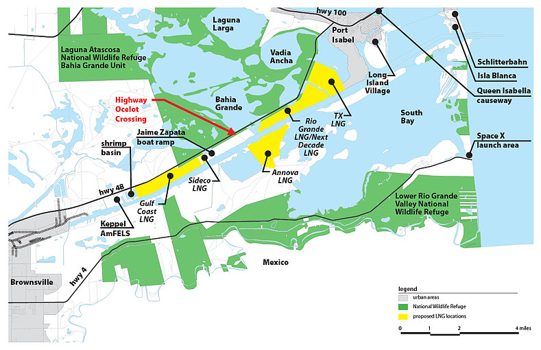 The area’s ecosystem will be fundamentally altered by the construction, bright lights, tall structures, air pollution and wastewater of the Rio Grande LNG Terminal. For example, endangered ocelots and Aplomado falcons roam this area. As of August 2015, only 53 ocelots were left in Texas and they were all found here.