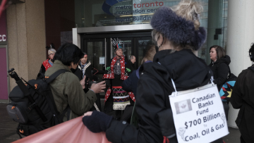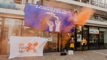 - Engage with banks: we directly engage with banks to raise standards, either in banks’ own policies or as part of financial sector initiatives. Together with partners, BankTrack has pushed initiatives like the Net Zero Banking Alliance, the Equator Principles and the Principles for Responsible Banking to strengthen their commitments on climate action. We also attend multiple Annual General Meetings (AGMs), regularly bringing frontline defenders along to make the case for fossil free banking.